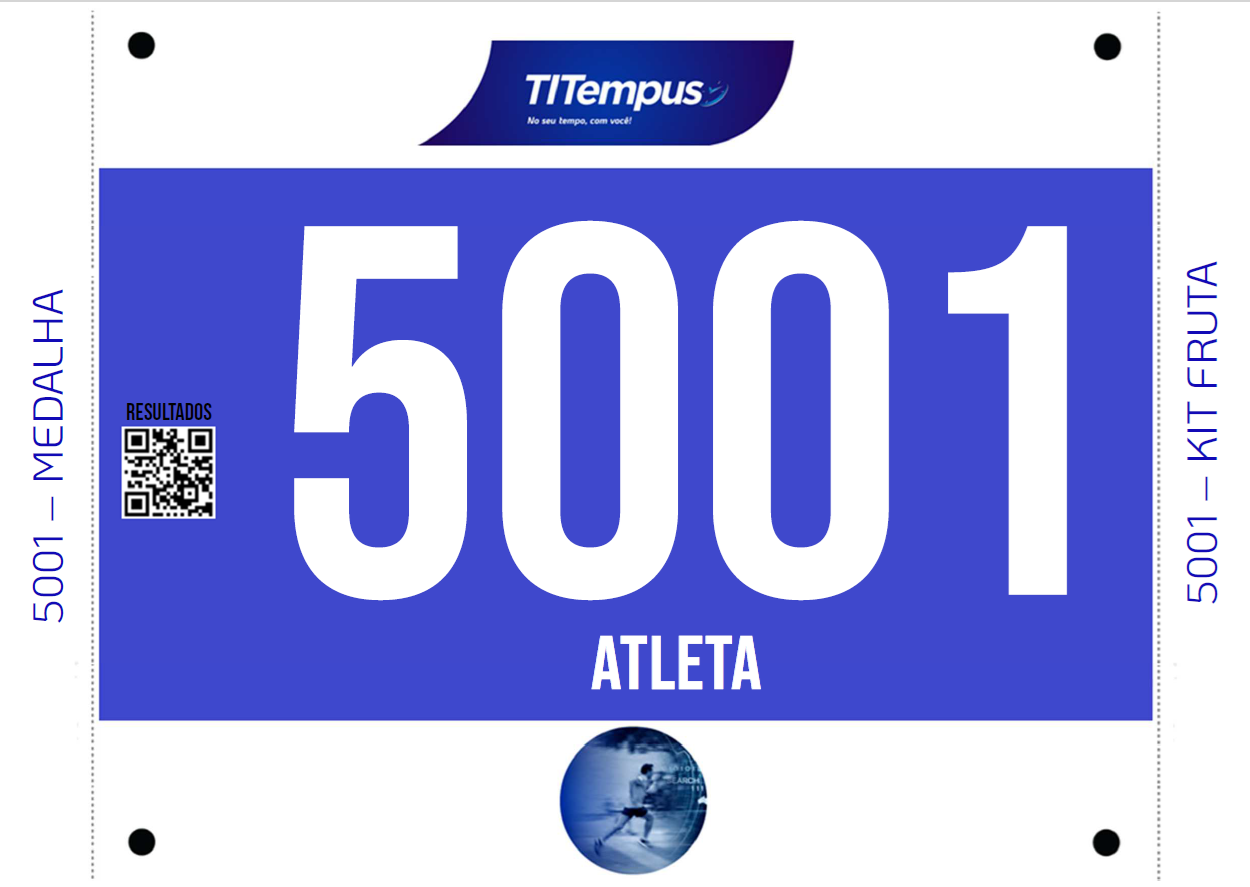 Numerais de peito, com ou sem chip de tecnologia RFID, para o seu evento esportivo. Embalados individualmente em envelopes de papel ou plástico, com os seus respectivos alfinetes de segurança para fixação nas camisas. Devidamente identificados, são entregues prontos à adição nos kits dos atletas.